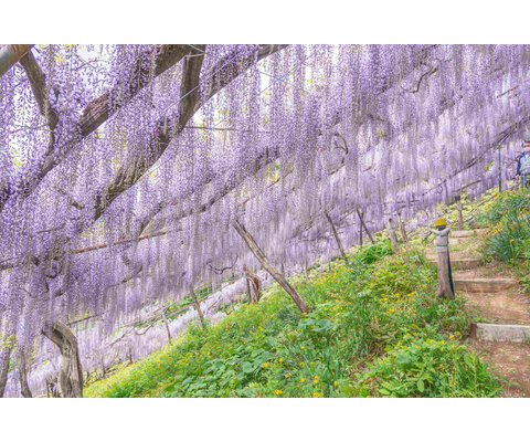 This wisteria garden is home to wild wisteria blooming on sloping land, resembling Niagara Falls.