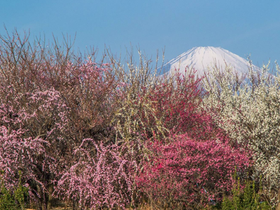 Picture postcard photos taken at the Soga (Bessho) plum grove - a beautiful combination with Mt. Fuji