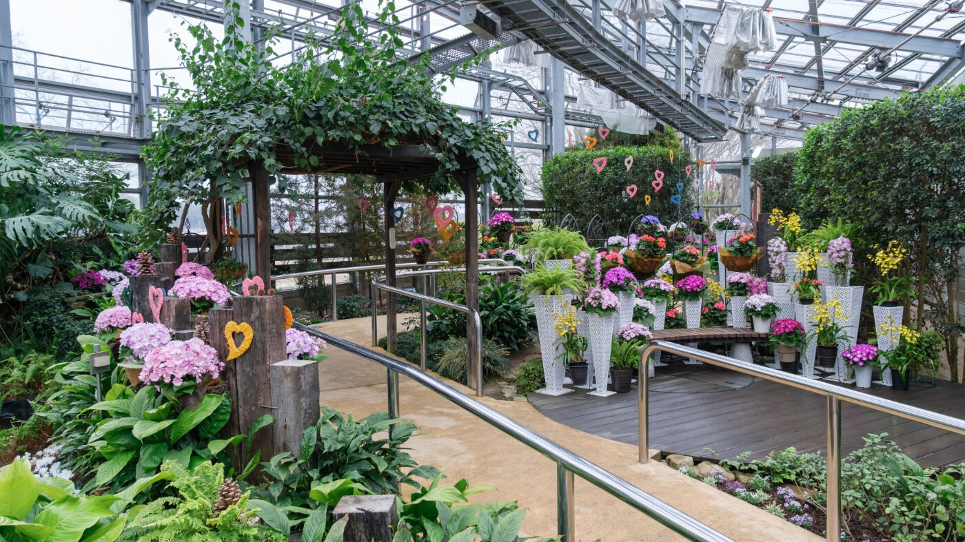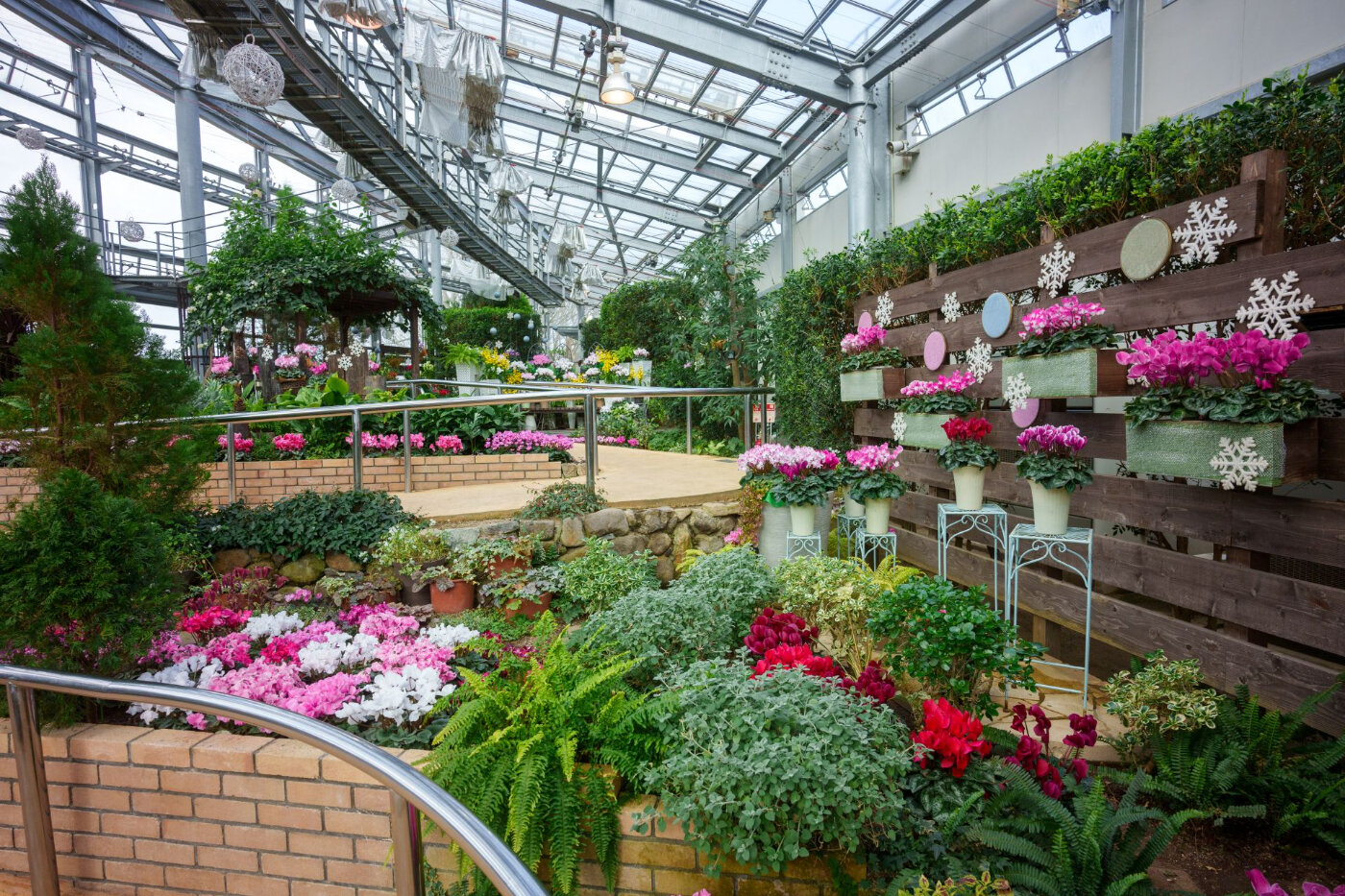 A wide variety of seasonal flowers are planted in the glass room located roughly halfway through the facility.