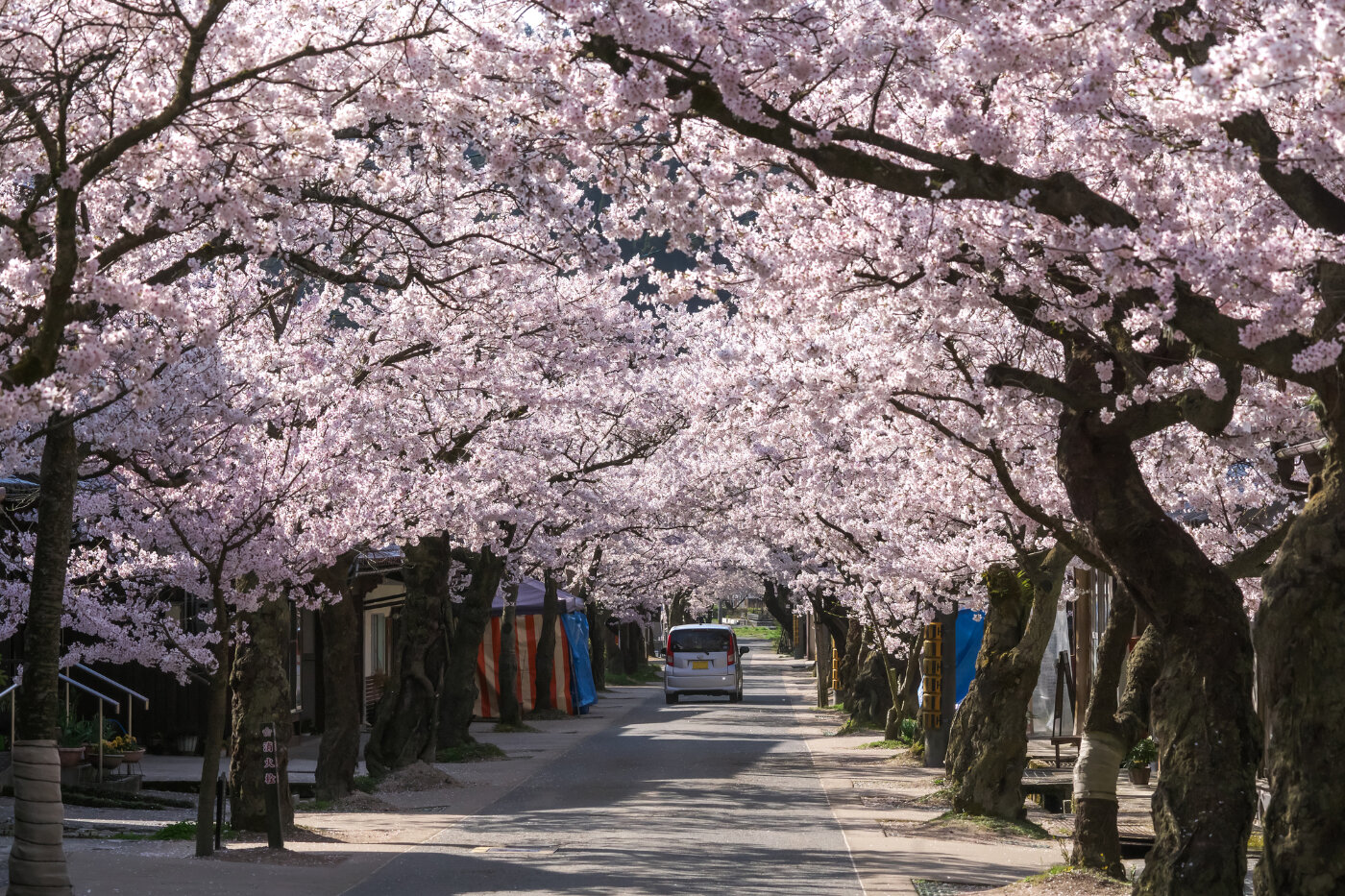 現在5.5mおきに樹齢100年を超える古木を含む133本のソメイヨシノがあり、約400mの桜並木のトンネルは新庄村の春を代表する景色です。