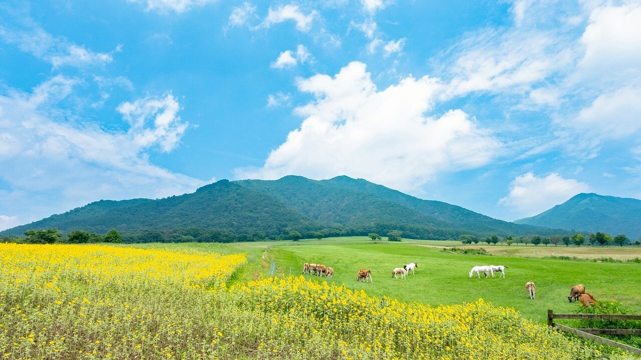 上蒜山(かみひるぜん)山麓にある広大な牧草地です。蒜山三座を背景にジャージー牛の放牧が雄大です。夏はひまわり畑が広がります。