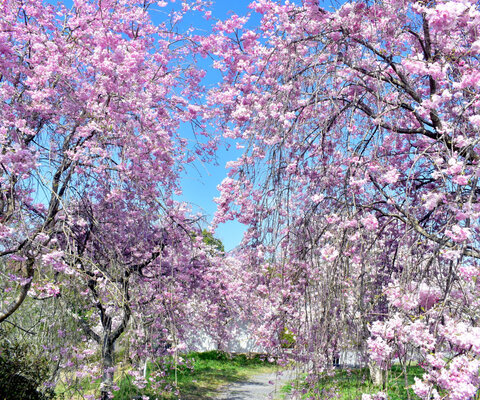 本殿と拝殿を結ぶ長い回廊(廻廊)では、春は桜・初夏は青もみじや牡丹・秋は紅葉と四季折々の姿を楽しむことができます。