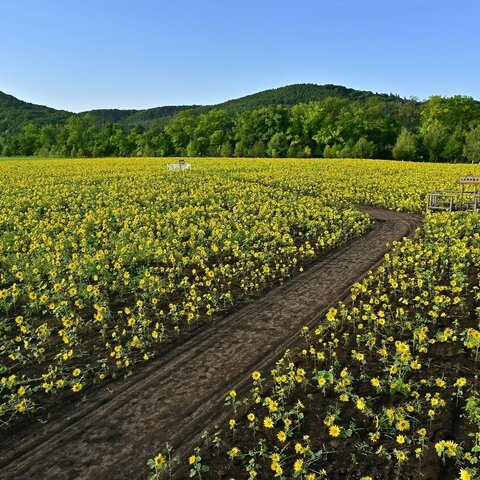 網走湖大曲湖畔、網走刑務所旧農場跡地、14haに260万本のひまわりが咲きます。2期作で栽培され、見ごろ...