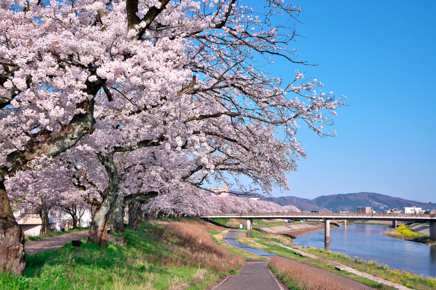 足羽川の木田橋ー新明里橋の間、全長2.2kmに約600本の桜並木。日本さくら名所100選。