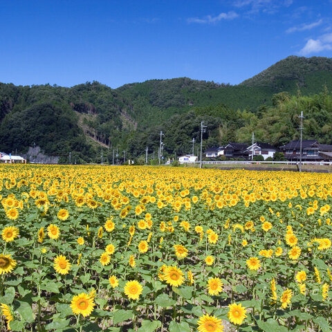 西日本最大級、合計数十万本のひまわりが咲く畑。町内で時期と場所をずらして咲きます。