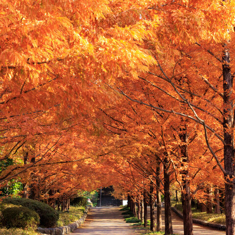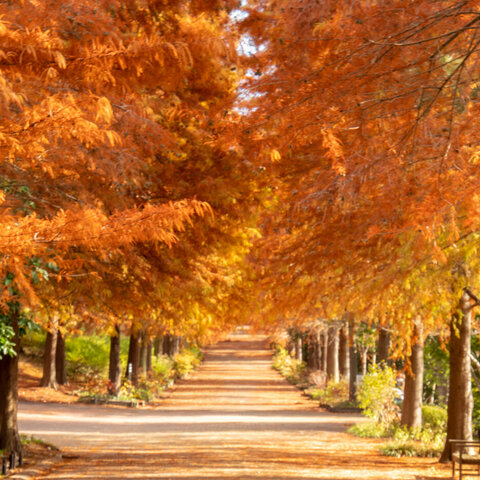 桜の園には1,000本のソメイヨシノ、バラ園にはモダンローズ中心に95種2,000株のバラ。秋になると落羽松...
