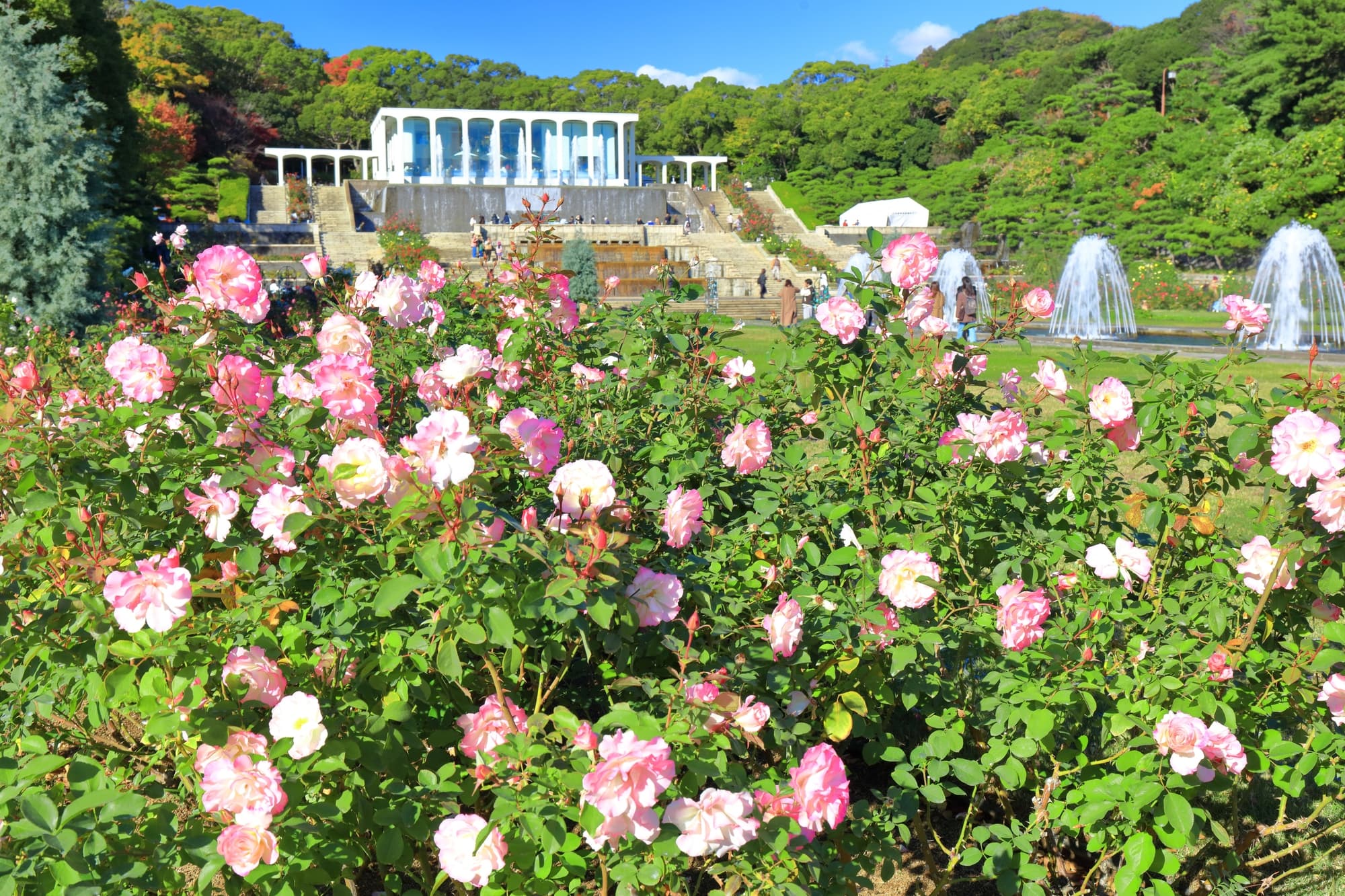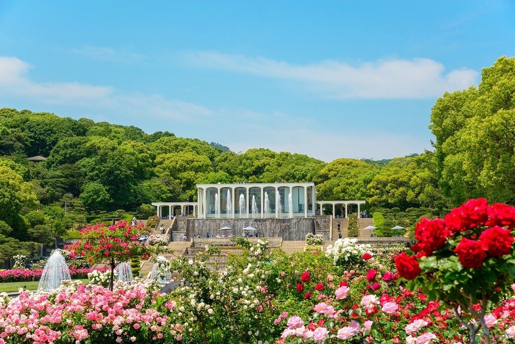 須磨離宮公園は兵庫県神戸市須磨区の丘陵に広がる皇室の別荘「武庫離宮」の跡地に整備された都市公園で、西洋式庭園を中心とする本園エリアと植物園エリアからなります。須磨離宮公園のバラは有名で、本園エリア内の噴水広場にはベルサイユ宮殿の庭園をモデルにした「王侯貴族のバラ園」、中門広場には「世界殿堂入りバラ園」と「バラの歴史と文化園」があり、「王侯貴族のバラ園」では約180種4,000本のバラが植栽されています。春バラの時期には一斉に咲き誇り、秋バラではその香りを楽しめます。「世界殿堂入りバラ園」では殿堂入りしたバラ全17種(H31時点)が植栽されており、5月初旬から咲き始める「バラの歴史と文化園」では野生種からモダンローズに至る歴史を巡ることができます。