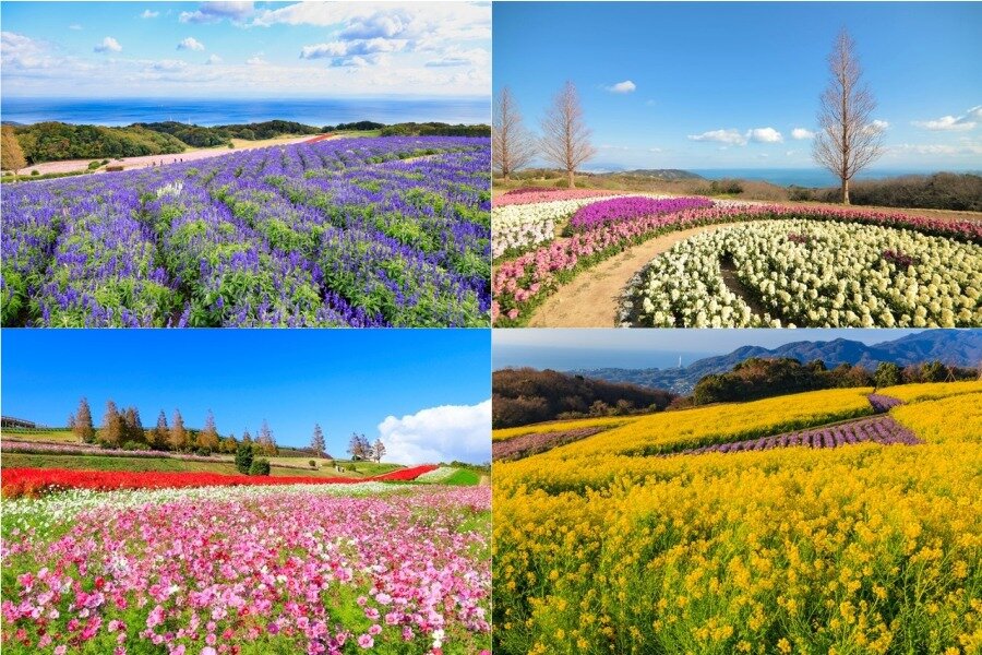 桟敷(さじき)とは、祭や花火を見物するために作られた観覧席のことで、花畑を楽しめる極上の見物席として「あわじ花さじき」と名付けられました。大阪湾を背景に咲く四季折々の一面の花風景が楽しめる人気スポットです。中でも寒さに強いく真冬に見頃となるストックの花は、昭和の初め頃から淡路島の名産となっています。