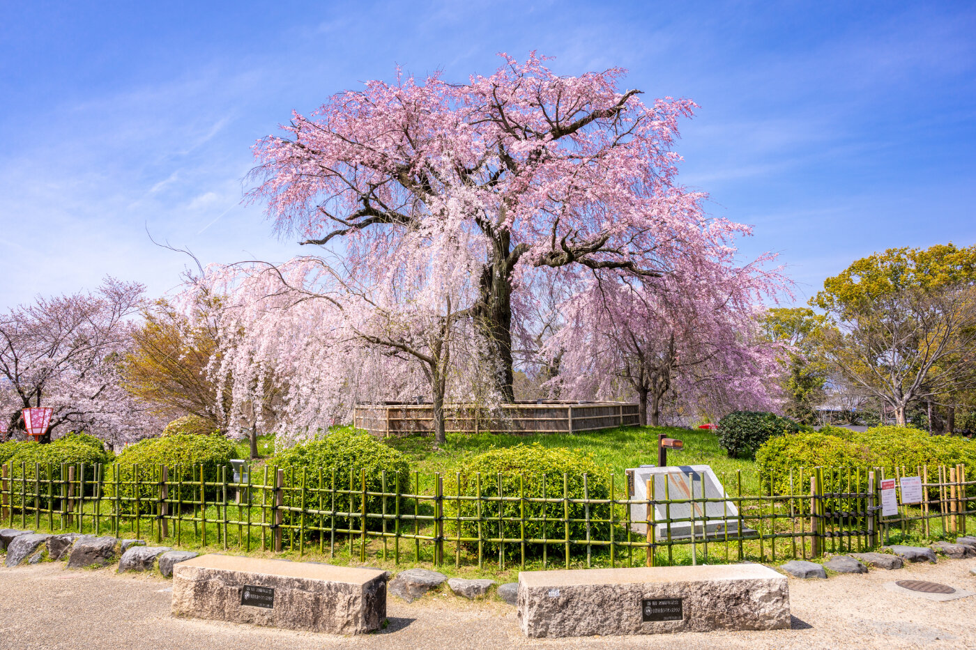 円山公園は京都市東山区に位置し、桜の名所として全国的に有名な公園です。特に枝垂れ桜は多くの観光客や花見客が訪れる春のシンボルとなっています。円山公園は八坂神社に隣接し、京都を代表する桜のスポットとして、古くから親しまれてきました。公園全体には枝垂れ桜だけでなく、ソメイヨシノやエゾヤマザクラなど約650本の桜が植えられており、広い範囲で桜を楽しむことができます。園内は広々としており、ゆっくりと散策しながら桜の美しさを堪能できます。