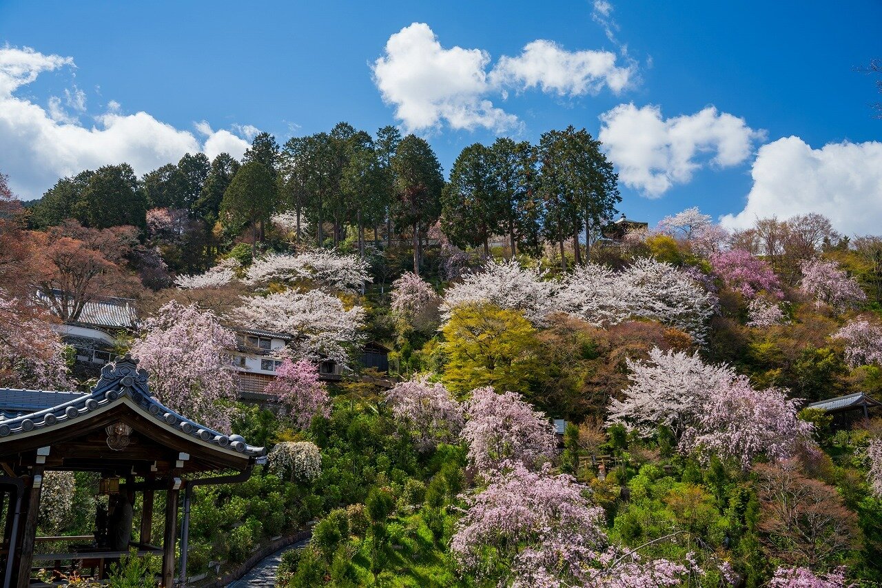境内には100本以上の桜があり、お手植えの桜は樹齢300年の名木。JR東海の「そうだ京都行こう」のCMで放映された桜。彼岸桜、しだれ桜、山桜、ぼたん桜などの桜が山全体に咲きます。また、3,000坪の白山あじさい苑では、約8,000株の紫陽 花が斜面一面を彩ります。その他、牡丹、平戸つつじ、サツキ、梅などが楽しめます。秋は、シュウメイギクや紅葉が綺麗です。