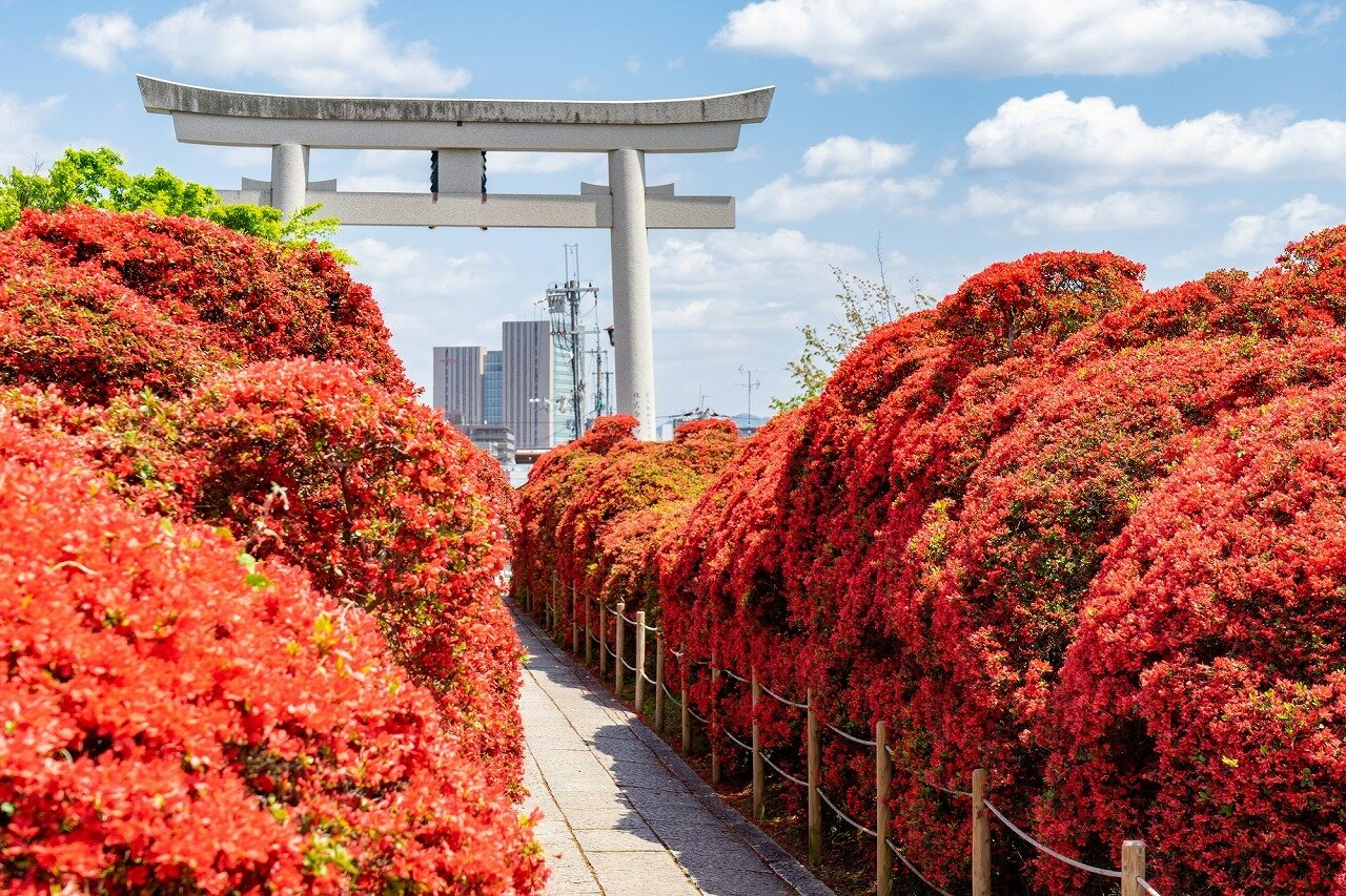 シンボルの大鳥居をくぐると、両側には樹高約2.5mの真っ赤なキリシマツツジが約60mにも渡って多数植えられています。樹齢は約170年の古樹でその美しさは日本随一とも言われておりツツジを目当てに多くの人々が訪れます。灌漑用として造られた周囲約1キロメートルの八条ヶ池の中堤の回廊に、真っ赤なツツジが咲き誇る風景は息を飲むほどの美しさです。このキリシマツツジは長岡京市の天然記念物にも指定されています。