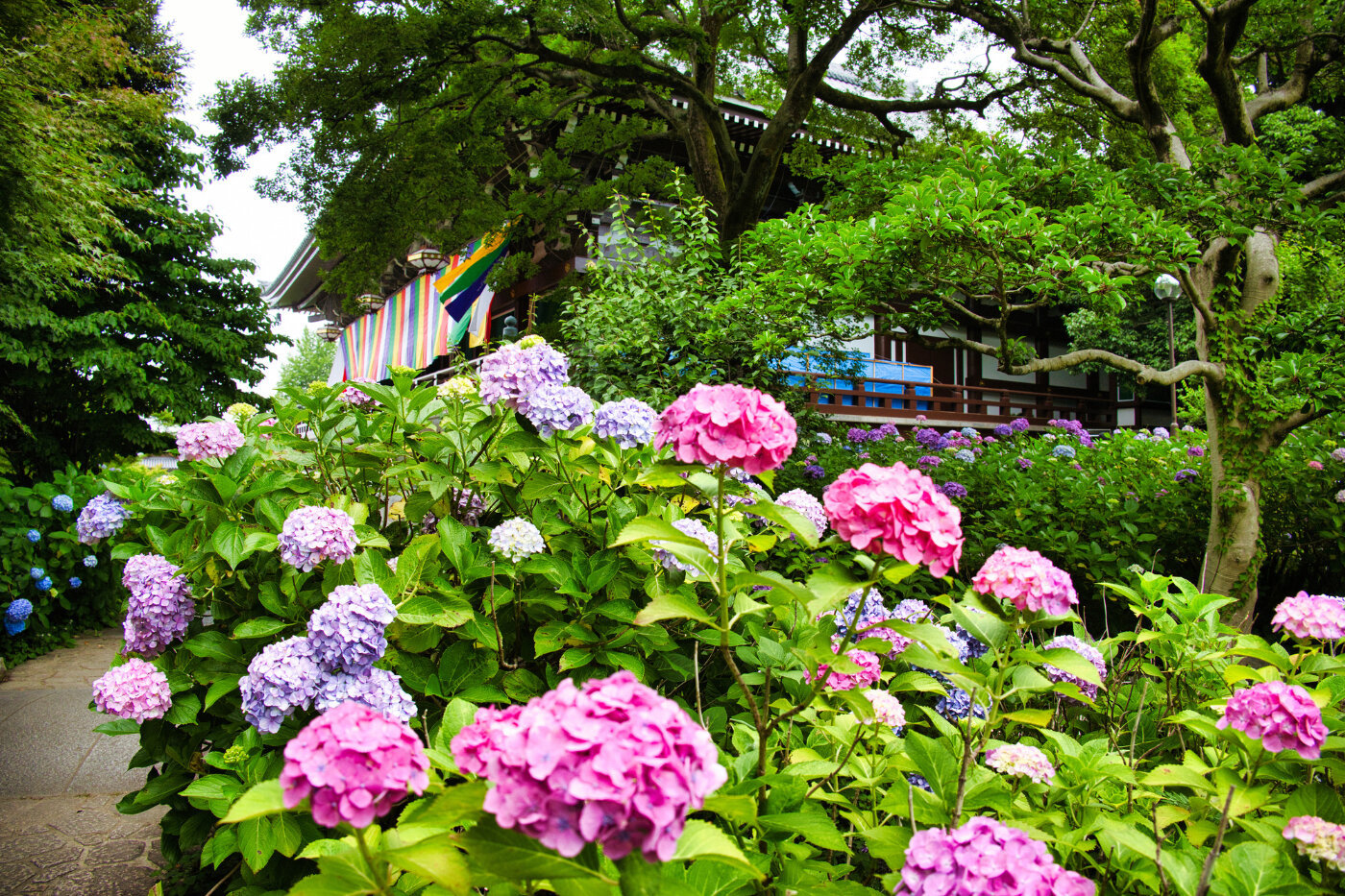 智積院(ちしゃくいん)は、京都市東山区にある真言宗智山派の総本山で、美しい庭園と四季折々の花々が魅力の寺院です。特に、あじさいの季節には寺内の庭園や境内に色とりどりのあじさいが咲き誇り、訪れる人々を楽しませてます。見頃を迎える6月中旬には金堂の裏手にあじさい園、また金堂から大師堂へと向かう途中にも参拝者を迎え咲いています。また春は梅、桜、ツツジなど、夏にはサツキ、桔梗、百日紅などの花が境内を彩っています。