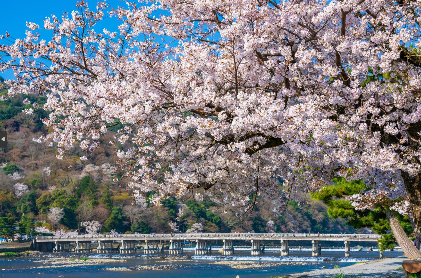 山肌を彩る山桜や、寺院の庭園で見られる枝垂桜、道沿いに咲くソメイヨシノなど、嵐山では3月中旬から4月まで、いろんな桜が楽しめます。