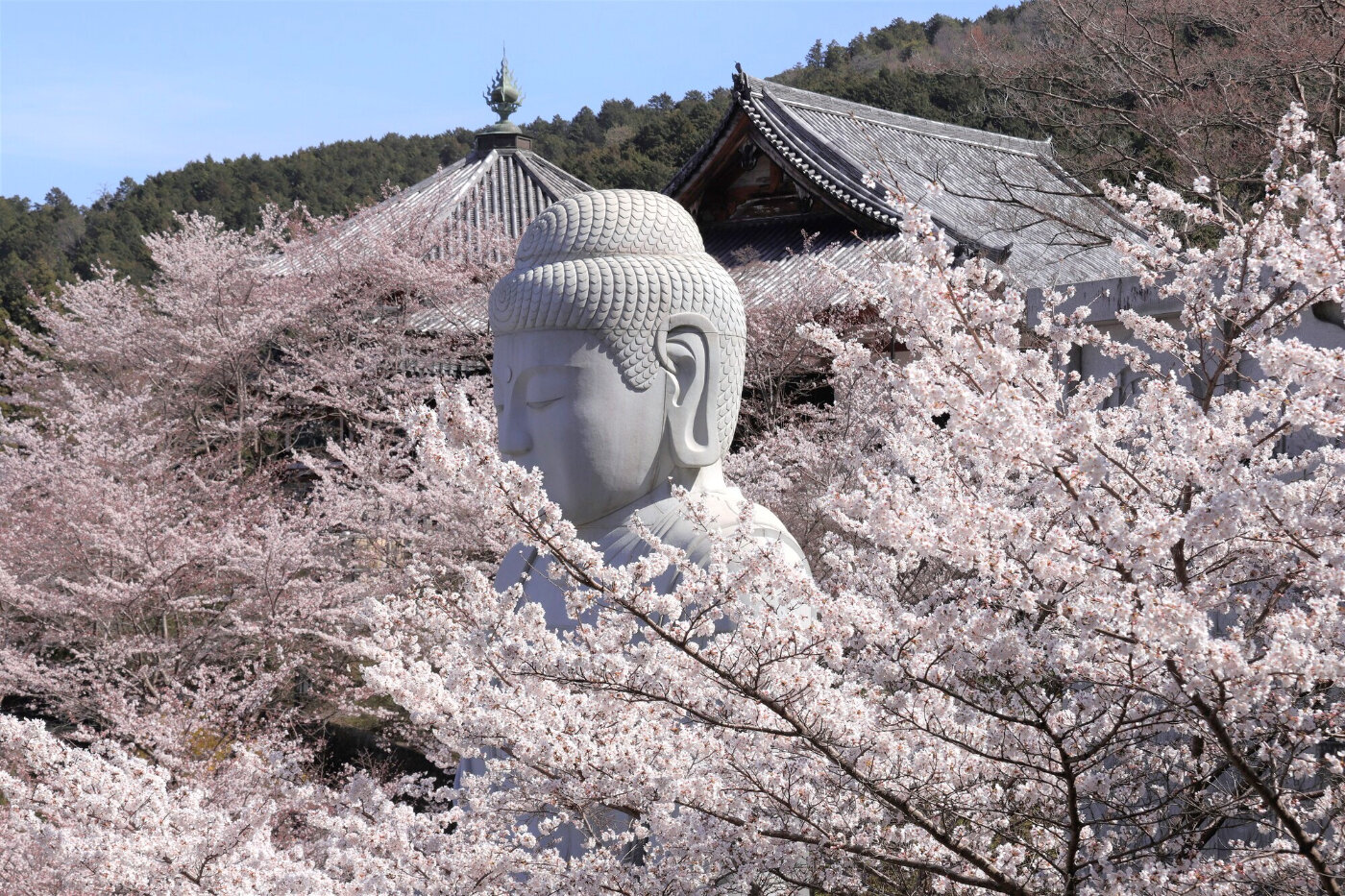 桜の時期は、300本といわれる桜に埋もれる釈迦如来像が「桜大仏」として有名なお寺。あじさいの季節は、300株以上の自生のあじさいと200鉢のあじさいを並べ、長谷寺、岡寺の3カ寺で「大和三大観音あぢさゐ回廊」を開催。