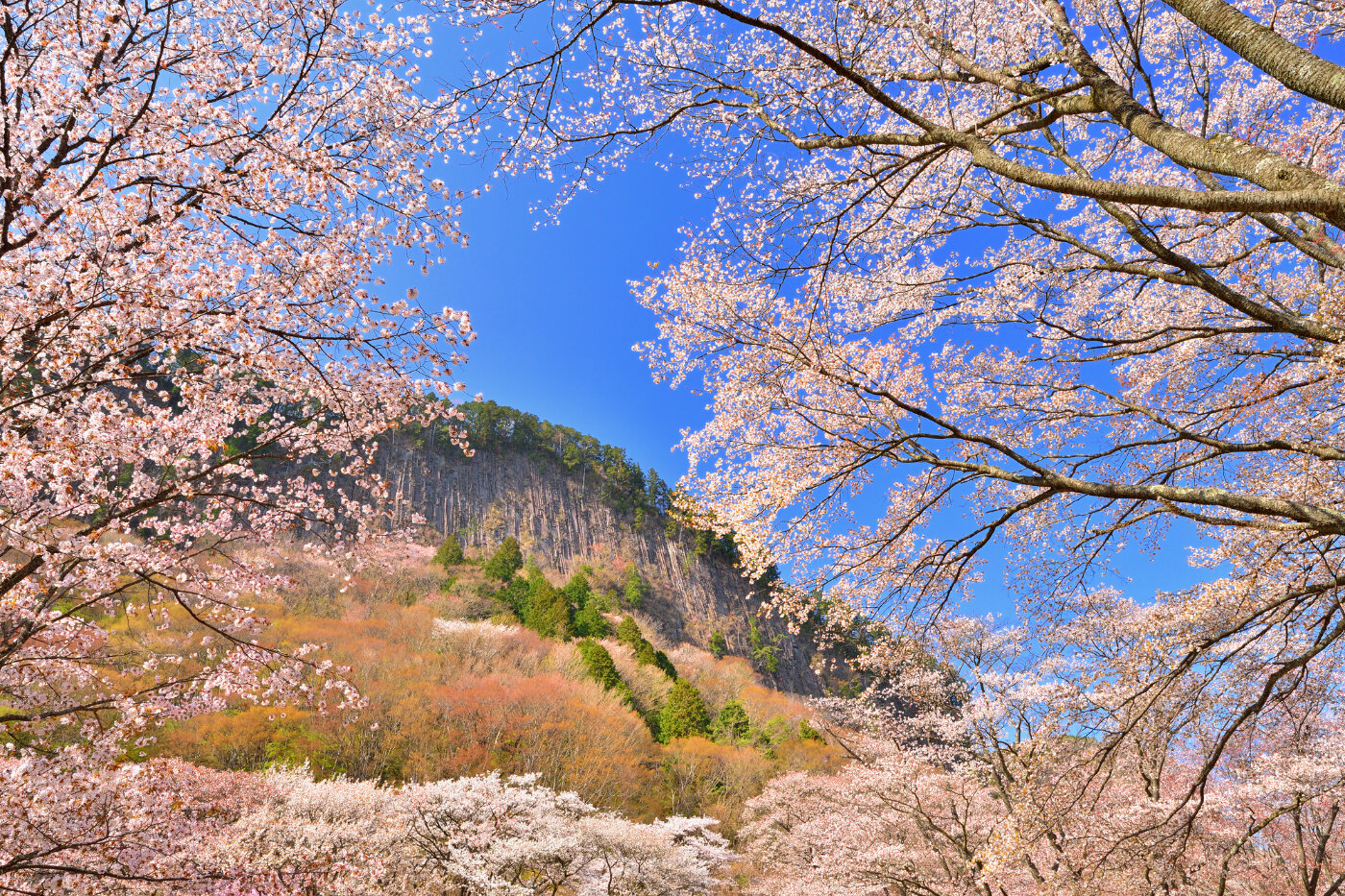 奈良県宇陀郡曽爾村には、屏風を立てたように見える奇峯、国の天然記念物「屏風岩」という名所があります。4月中旬から下旬にはその麓にある公苑に樹齢100年越えの山桜約300本が咲き乱れ、また岩壁にはミツバツツジなどが咲き誇り、訪れた観光客を楽しませています。夜間ライトアップ期間中は日中とはまた違う景色も楽しめます。
