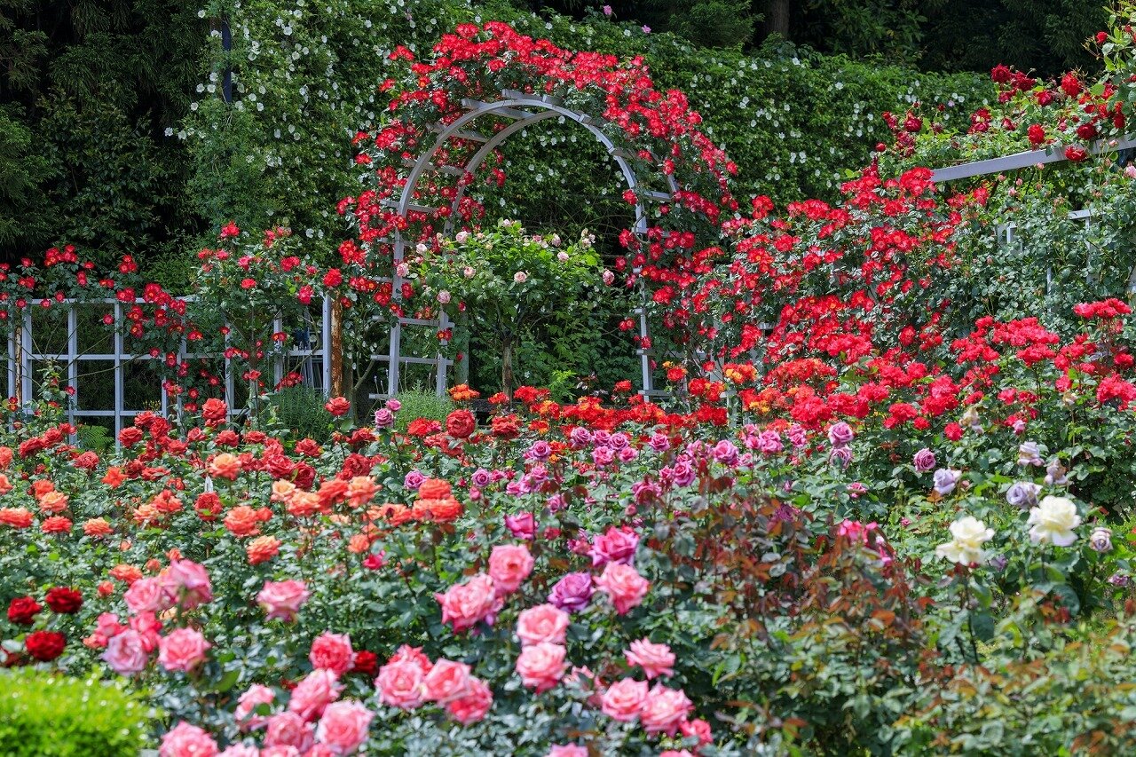 生駒山の麓、奈良市中町にある「霊山寺」の境内の一角には、昭和32年に先代住職の戦争体験から平和を願って開園したバラ庭園があります。約1200坪のバラ庭園のテーマは人生の輪廻。200種類2,000株のバラが5月上旬から6月中旬と10月中旬から11月上旬まで美しく咲き誇ります。庭園にはローズティー、ローズコーヒー、バラのアイスクリームなどが味わえるお店があり、店内では様々なローズグッズも扱っています。