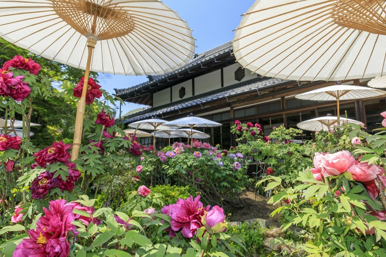 當麻寺の西端、奥院にぼたん園があります。二上山を背景に石仏が並ぶ独特の世界観の浄土庭園です。大方丈仏間の絵天井にぼたんの絵が描かれていたため数多くのぼたんを庭園に植樹し、仏前に御供したのが今日のぼたん園の始まりだそうです。和傘の下で咲く春の牡丹だけでなく、こもを被った冬ぼたんも展示されます。