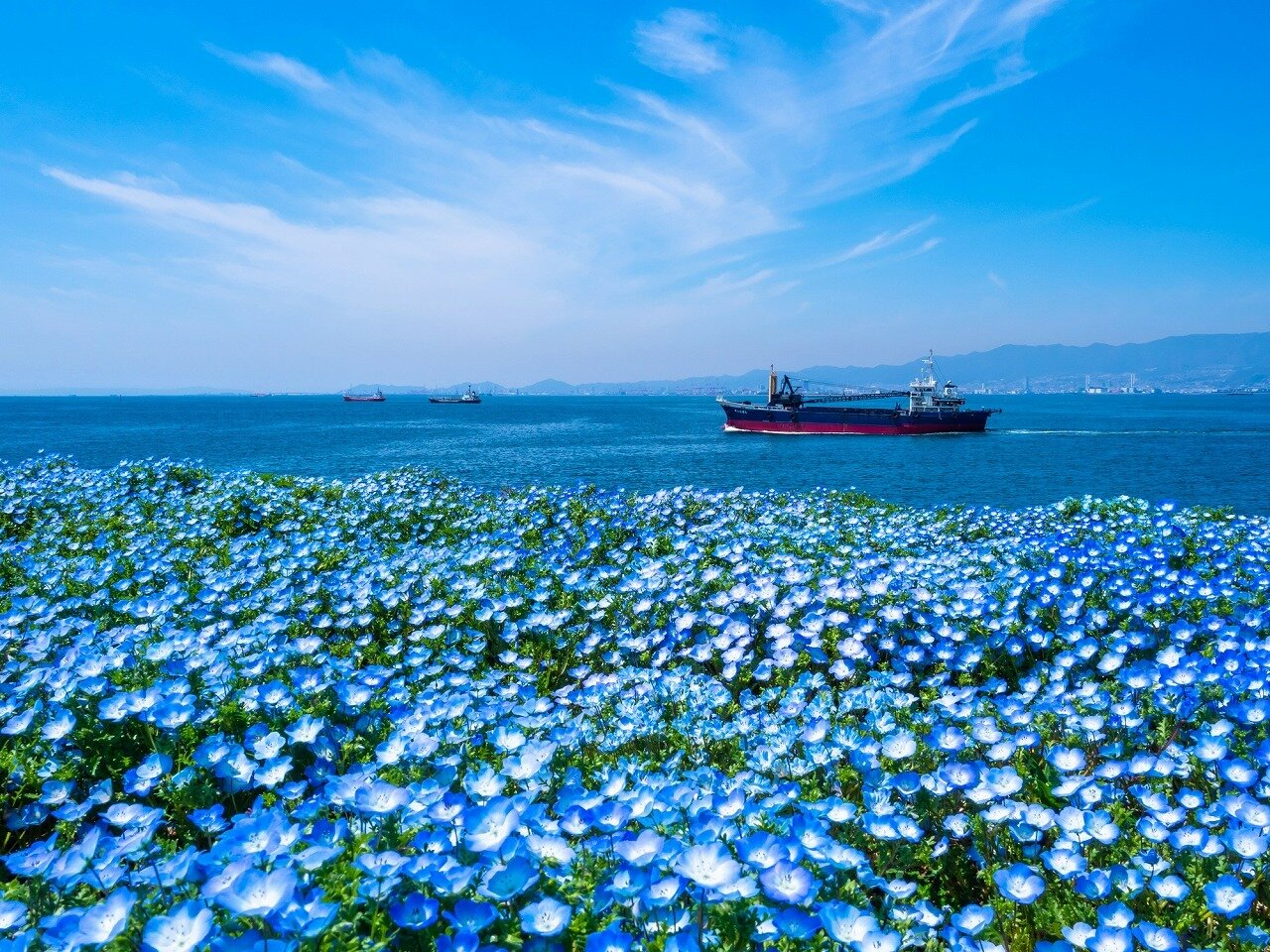 大阪まいしまシーサイドパークのネモフィラは、大阪にいながら自然の美しさを満喫できる貴重な場所です。青い花畑が広がる風景は、一度は見ておきたい絶景スポットです。見頃は4月中旬から5月上旬で、天気の良い日には特に美しい景色が広がります。約100万本のネモフィラが敷地全体に広がり、まるで青い絨毯が敷かれたかのような花々は空と海の青さと調和し、訪れる人々に幻想的な景色を見せてくれています。写真撮影スポットとしても人気で、インスタグラムなどのSNS映えする場所として、多くの観光客が写真を撮りに訪れまています。