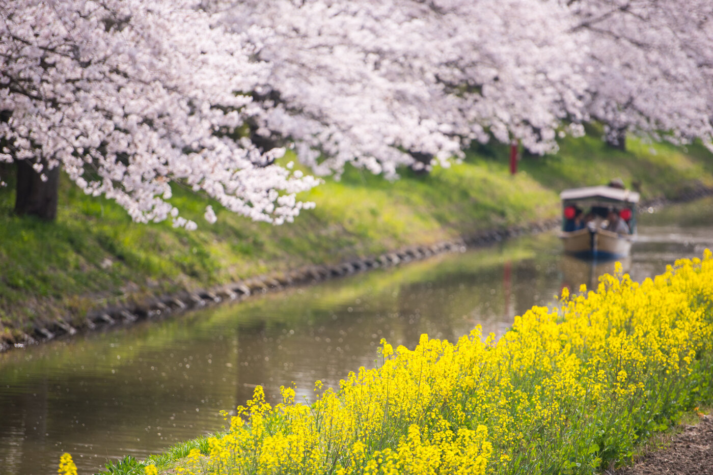 琵琶湖の周囲に存在する内湖の一つで、その中でも最大の西の湖(にしのこ)。その周辺の湿地帯が水郷と言われ、「ラムサール条約)」の登録エリアにもなっています。近江八幡の水郷めぐりは3月中旬から11月末までいくつかの会社や組合によって運行されていますが、特に4月上旬の桜並木と菜の花の中を手漕ぎ舟から見る景色やその様子は、江戸時代にでもタイムスリップしたような感覚になります。