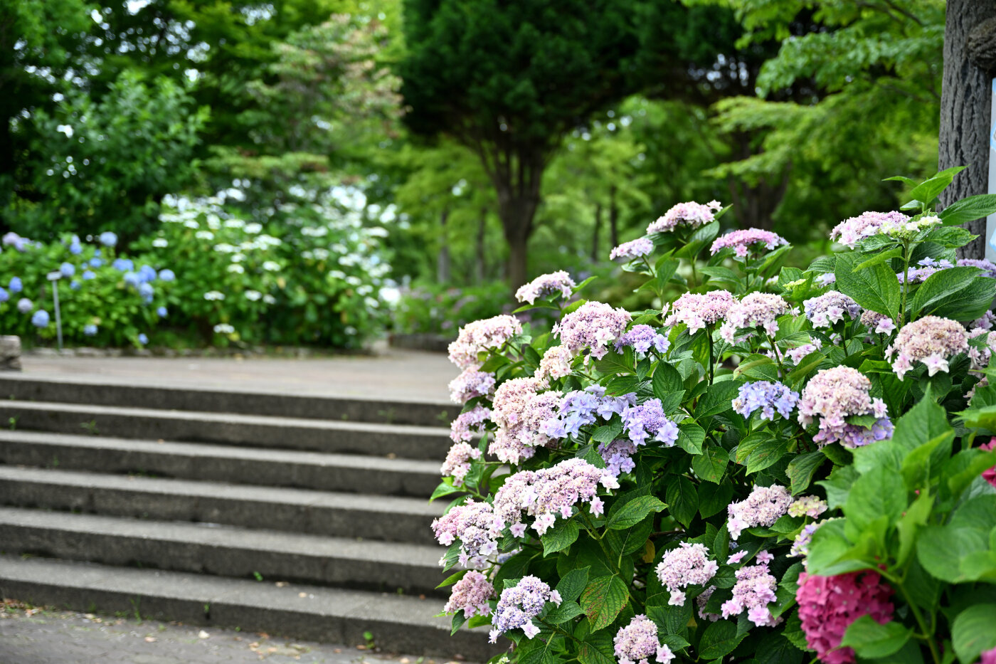 日本と西洋のあじさいがそれぞれ50品種、5,000本、計10,000本あるアジサイの名所。