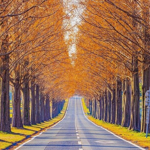 メタセコイアが500本植えられた並木道で、延長は2.4kmもあります。 新緑の青々とした初夏、紅葉した秋...