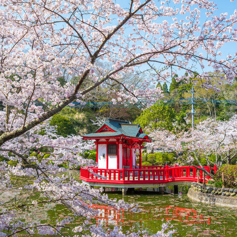 「日本さくら名所100選」に選ばれた約2,850本の桜がある名所。朱色の弁天堂と桜がフォトジェニックな公園。