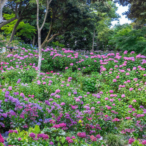 涸沼のほとりにある広大な公園を彩る約10,000株のあじさい。山の斜面いっぱいにあじさいが植えられたあ...