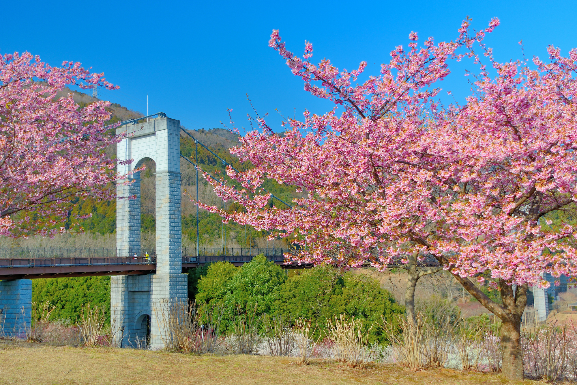 四季折々、いろいろな花が見られる公園です。紫陽花の時期は、「風の吊り橋」とのコラボショットが人気。