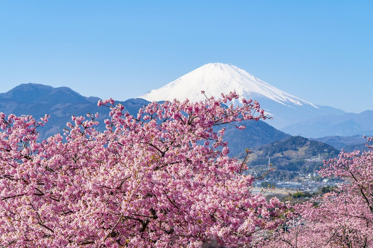 小田原市の北、丹沢山地最南端にある標高568mの山です。南山麓にある西平畑公園に360本の河津桜が咲きます。桜の木の下には菜の花が咲きます。雪を冠した富士山や、松田町の景色が展望できます。