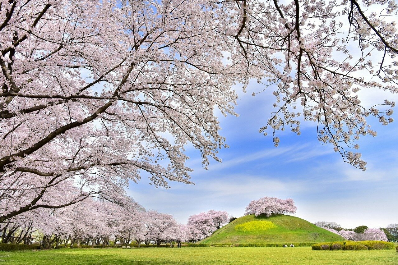 さきたま古墳群は、前方後円墳8基と円墳1基がある古墳群です。丸墓山円墳は、日本最大の円墳で、頂上や斜面、周囲に、200本のソメイヨシノが植えられています。