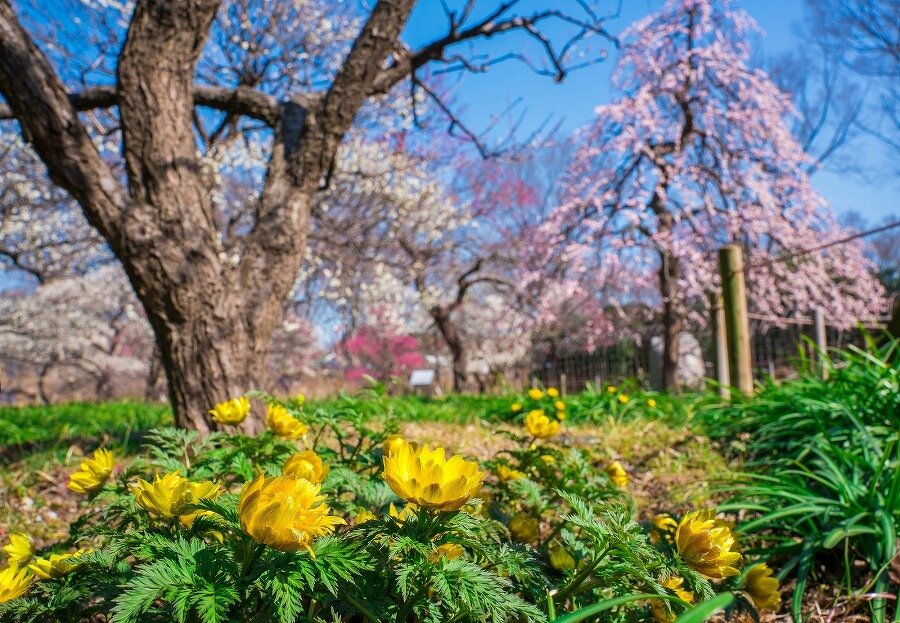太宰府天満宮から贈られた梅を含め120種約1,300本の梅が咲きます。120株からなる30mの萩のトンネル、あじさいは1万株、その他マンサクやフクジュソウなど早春の花々も楽しめます。彼岸花は8,000株と云われていましたが、近年大量の球根を植え、35万株に増加した模様です。