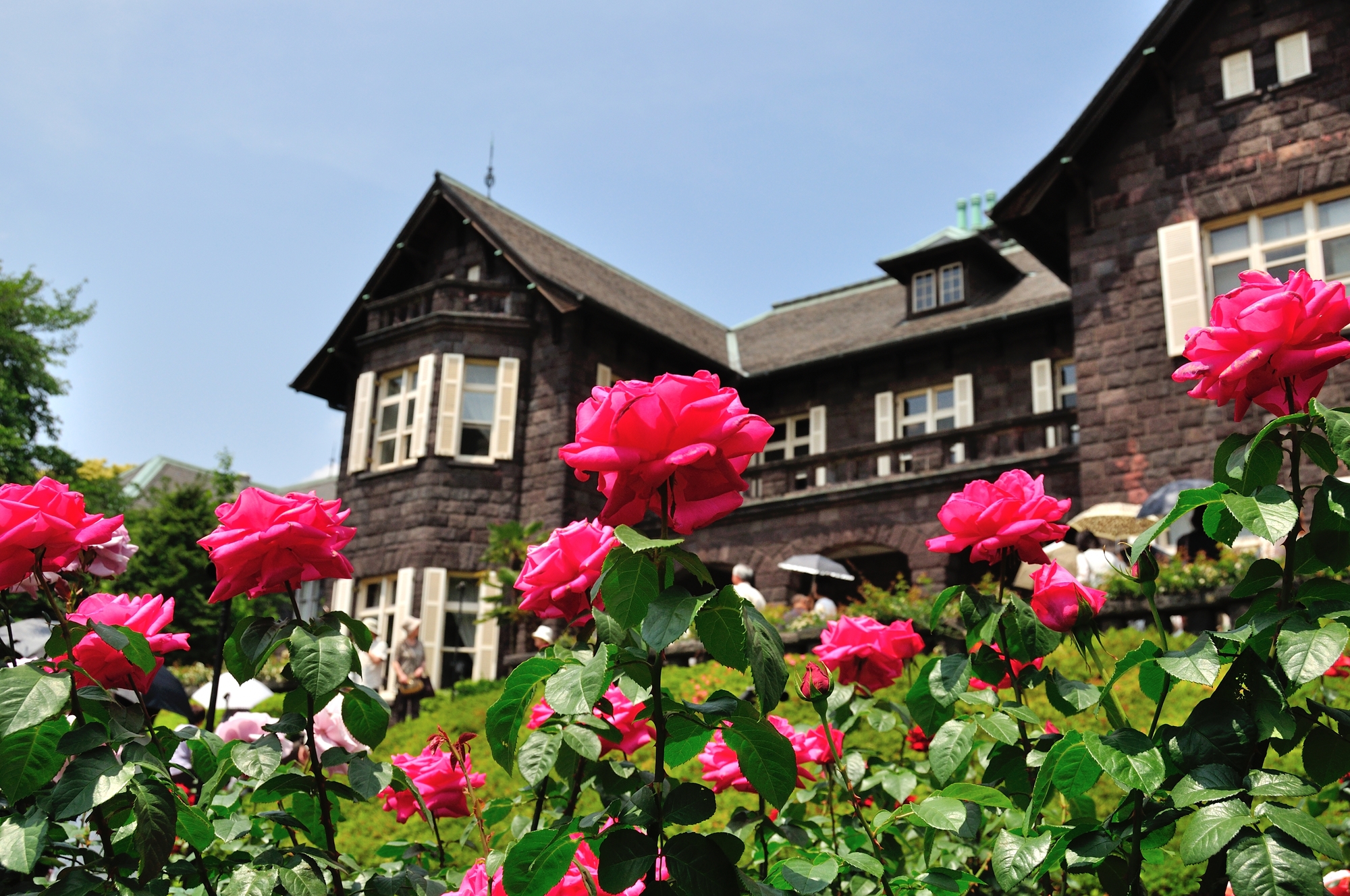 ジョサイア・コンドルという有名建築士が設計した、左右対称の幾何学模様のフランス整形式庭園。洋風の庭園には100種、199株のバラが植えられています。洋館と相まってまるで絵画のような景観で、海外の貴族になった気分で高貴な薔薇を楽しめます。