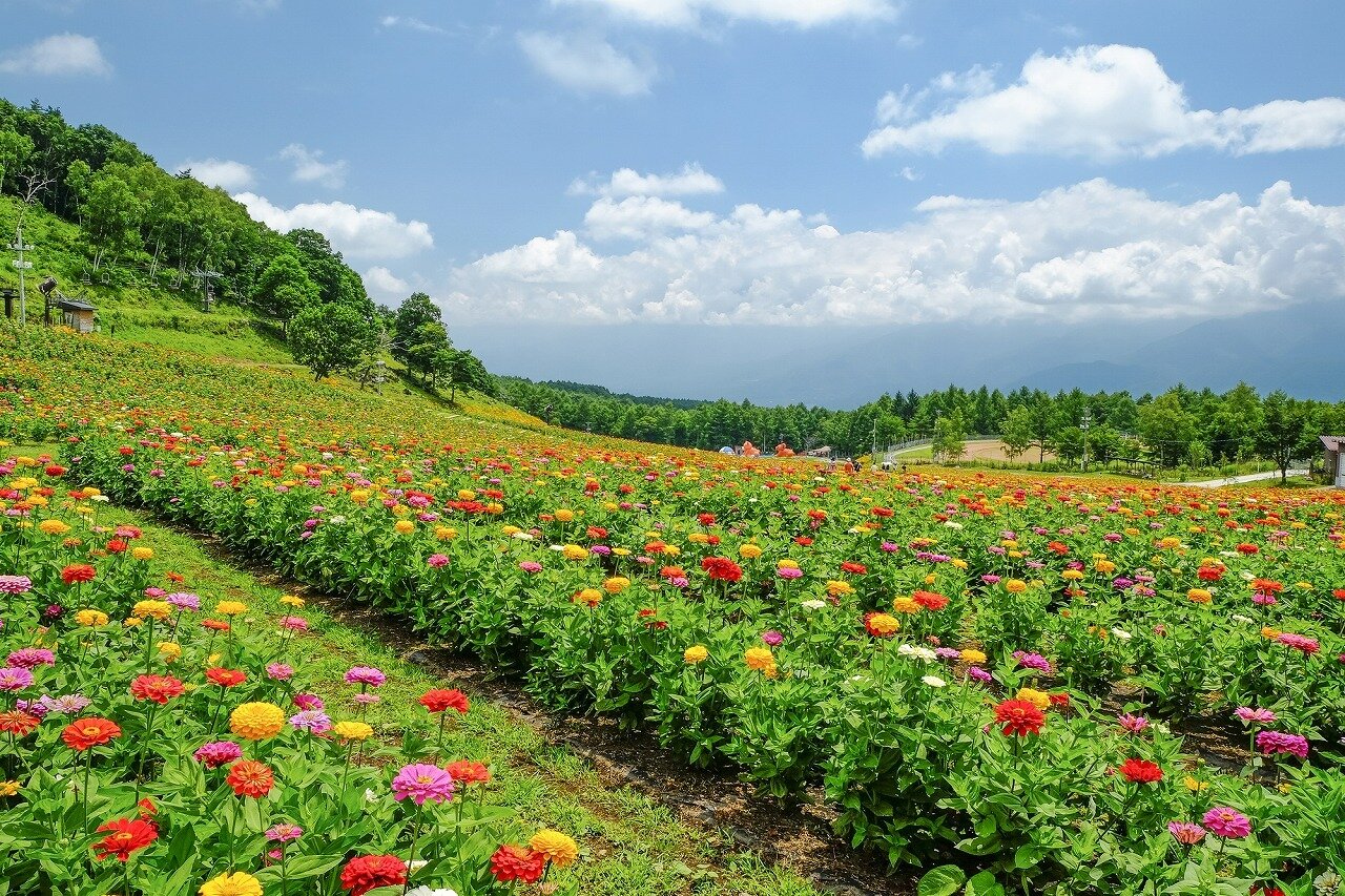 八ヶ岳編笠山山麓、標高1,250mに広がる天空の遊園地です。ロマンスエリア、白樺エリア、展望ロックガーデンの3つのエリアに色々な花が咲きます。