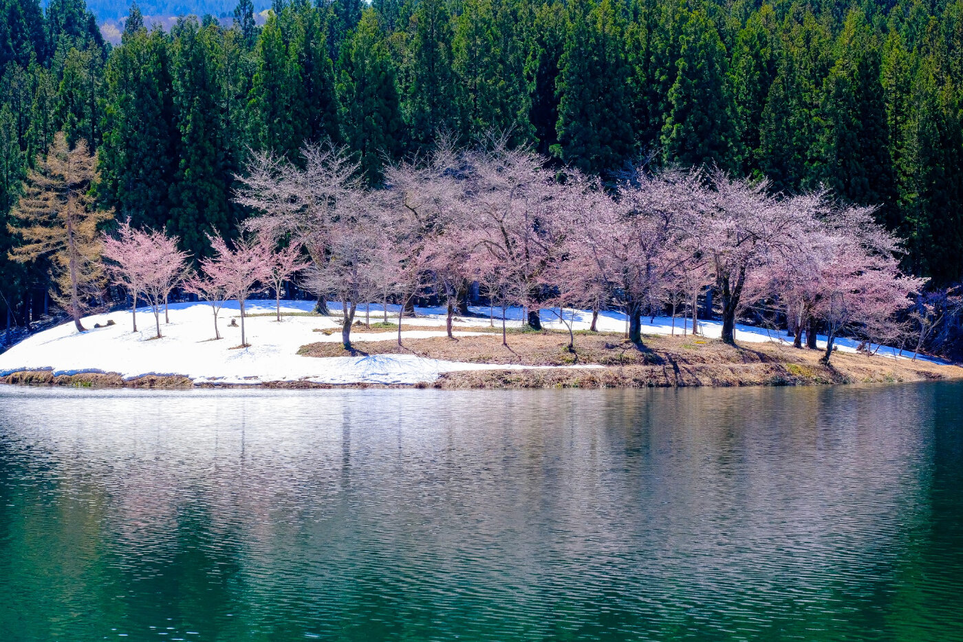 残雪と桜の競演や、湖面に映る桜が見られる、カメラマンに人気の絶景スポット。幻想的な朝霧に出会えることも。