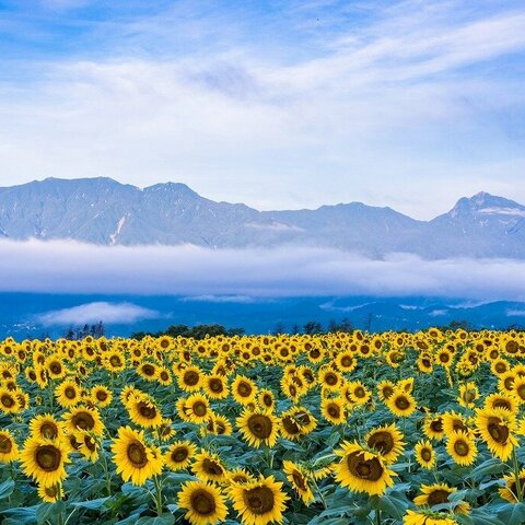 日照時間日本一の北杜市に40万本のひまわりが咲き誇ります。