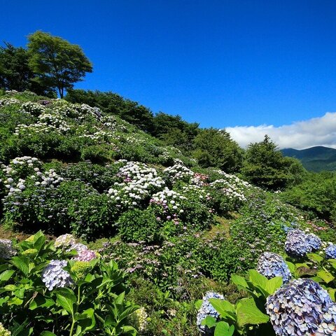 富士川沿い、南部町内船の小高い丘にある公園です。90種、3万株のアジサイが、山斜面一面に植えられてい...