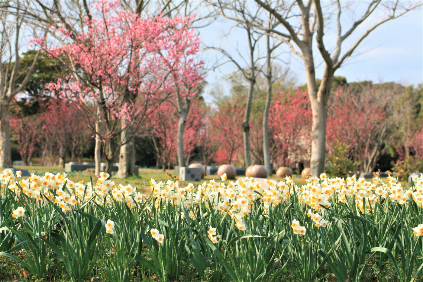 季節を通して様々な花が楽しめる、福岡の人気スポット。スイセンやネモフィラやコキア、コスモスなど一面に広がる花風景に出合えます。見頃の時期が合う年には、桜のピンクとネモフィラブルーの爽やかな共演を見ることができます。