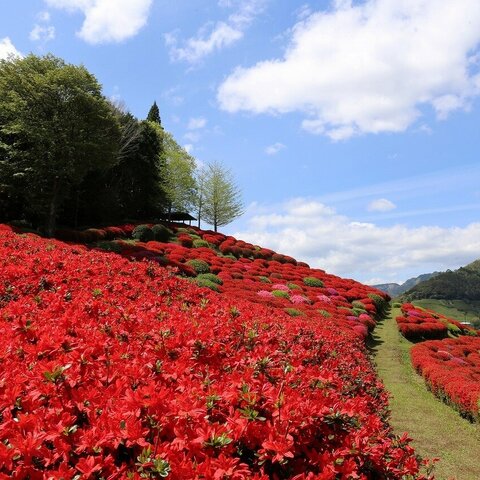 延岡市から高千穂峡に向かう途中にある日之影町の、役場前の小高い山斜面に2万本のキリシマツツジ、クル...