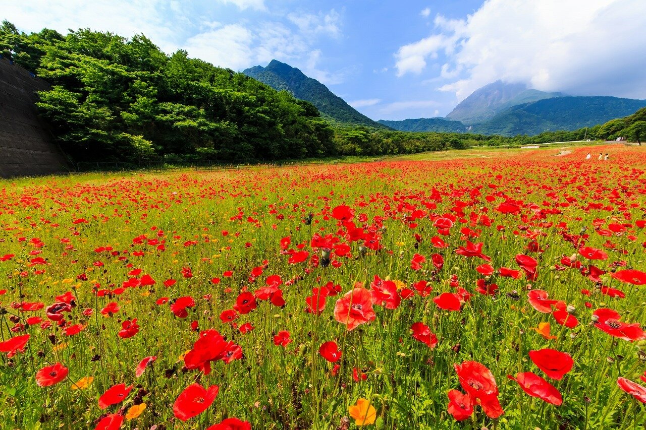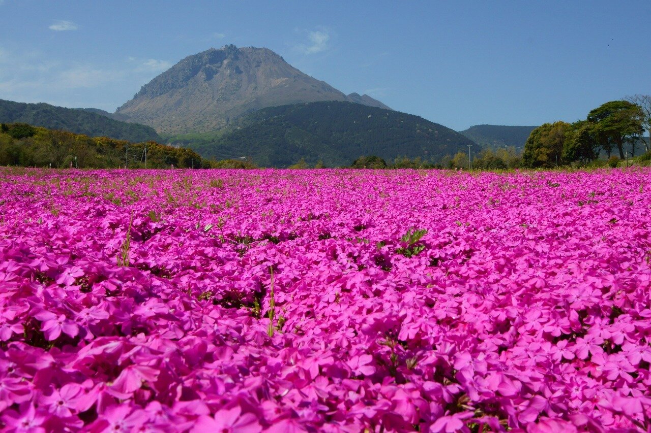 長崎県島原半島、雲仙普賢岳山麓の公園です。「火張山」の名前の由来は、ここに噴火災害時に火を見張っていた人がいたからです。普賢岳をバックに、春は桜、菜の花、ツツジ、ポピーが順に、秋はコスモスとひまわりが咲きます。