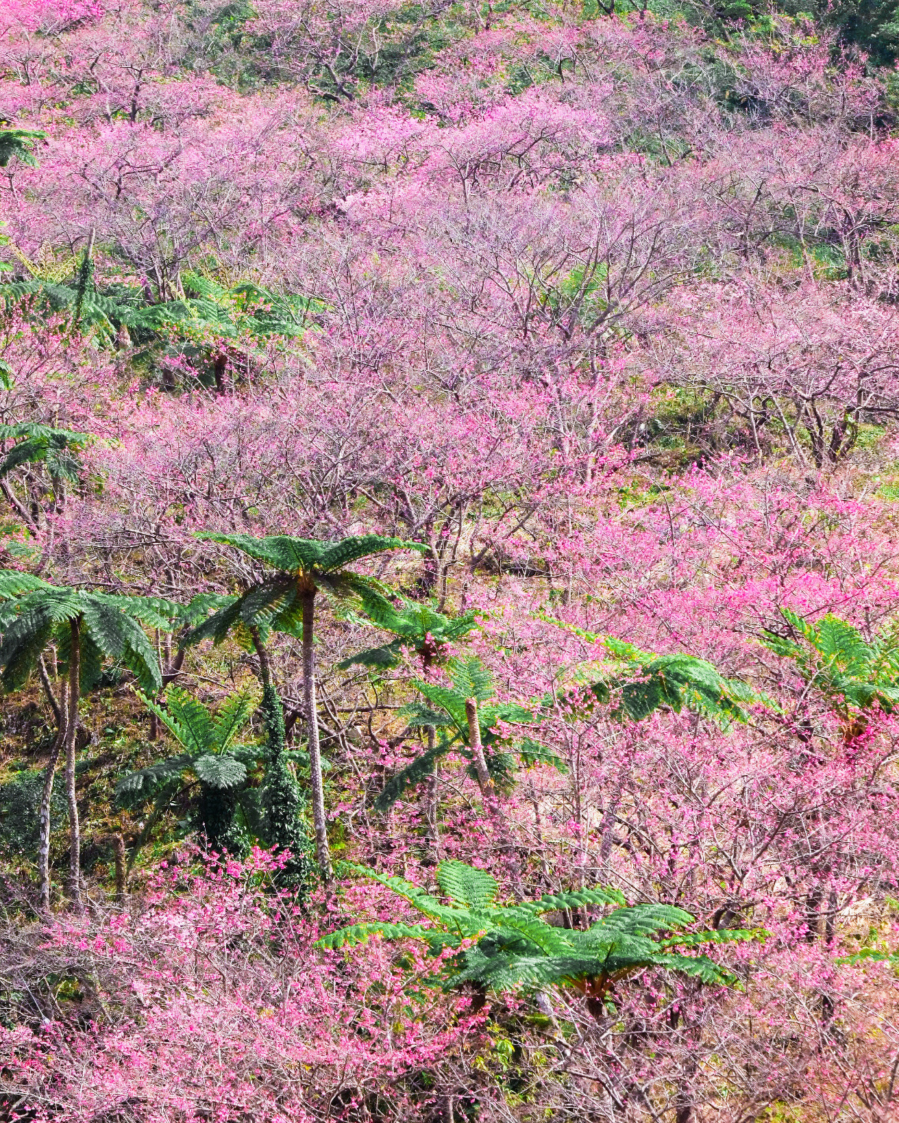沖縄の中でも一番に咲くと言われる桜の名所です。例年1月下旬から2月上旬頃までが見頃。頂上までの道沿い約4kmにわたり、約7,000本以上の寒緋桜が咲きます。