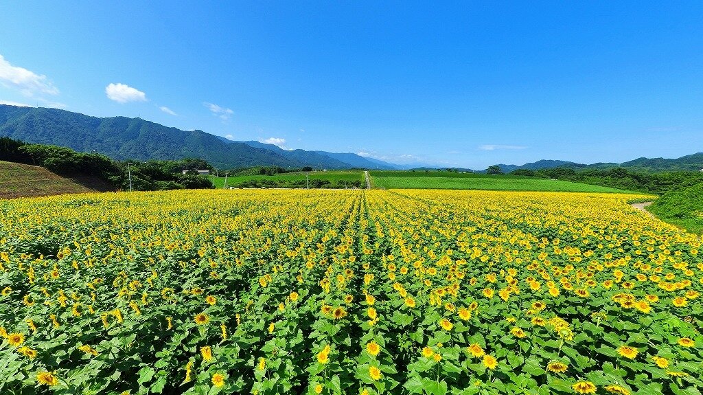青い空と阿讃の山々を背景に、31万本を超えるひまわり畑を眺めることができます。