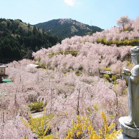 神山町(かみやまちょう)の山斜面に300本のシダレザクラと1,500本のレンギョウが咲きます。個人の植樹...
