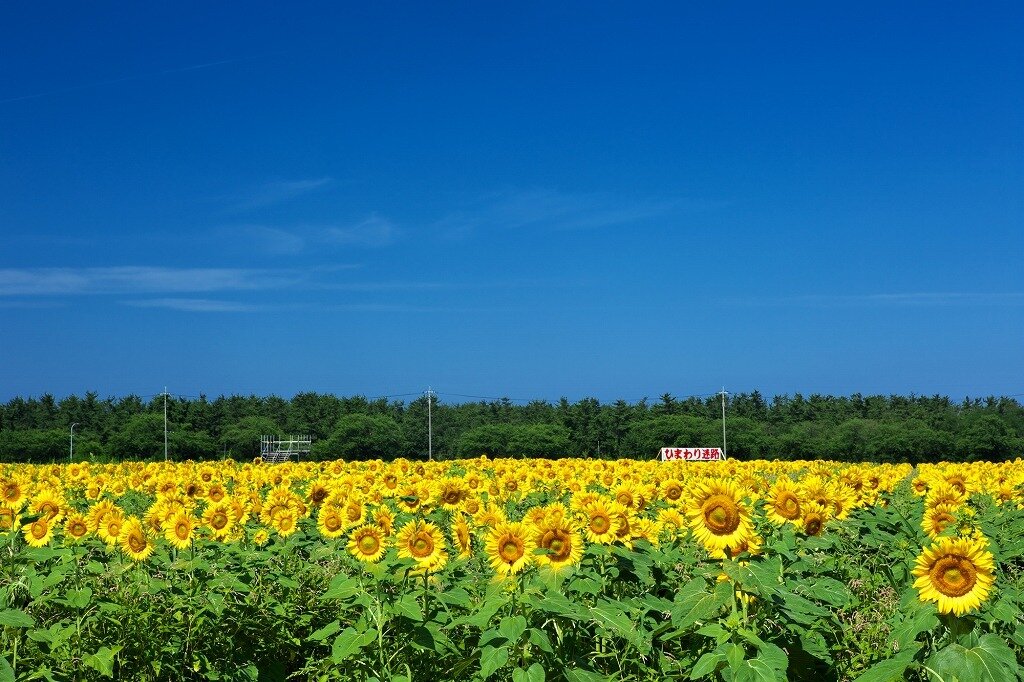 「道の駅にしめ」に隣接する転作田で、約30万本のひまわりが大輪の花を咲かせます。