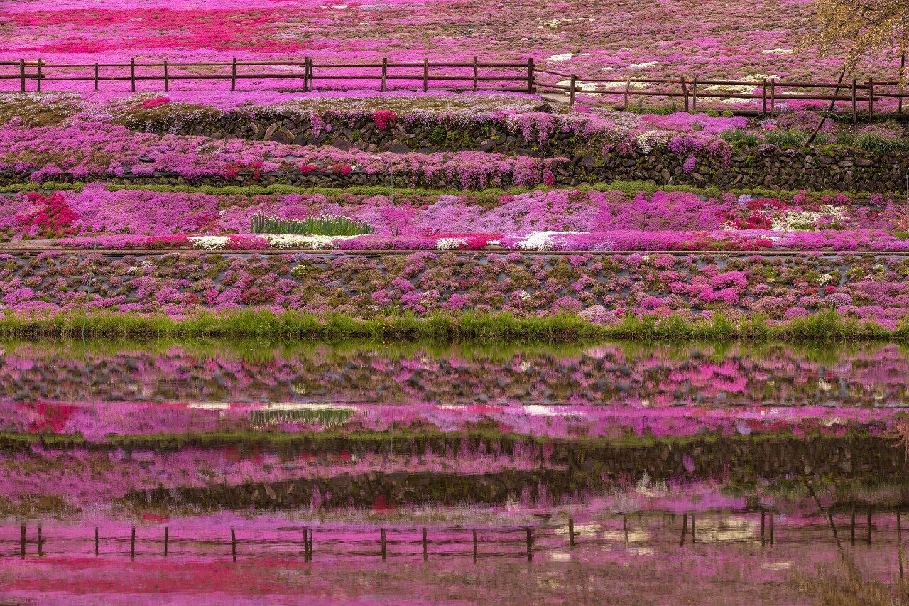 せせらぎ街道と呼ばれる一本道を走ると、長閑な山里の中に一面ピンクの芝桜で包まれた立派な一軒家があります。「花咲ばあちゃん」と呼ばれて多くの方に慕われていた『國田かなゑ』さんが、約50年もの歳月をかけて植え続けたろころ、農林水産大臣賞や内閣総理大臣賞を受賞するほどとなりました。現在はご家族や地元のボランティアの方々によって守られており、水が張られた田園に映る芝桜や、花桃や水仙なども楽しませていただくことができます。