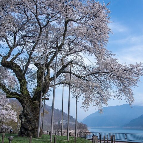 高山市、国道156号線沿い、御母衣ダム(みぼろだむ)湖岸に咲くアズマヒガンザクラの古木2本です。樹齢4...