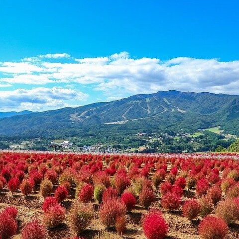 大日ヶ岳を望む見晴らしの良い場所です。真夏のペチュニアから秋のコキアまで楽しめます。