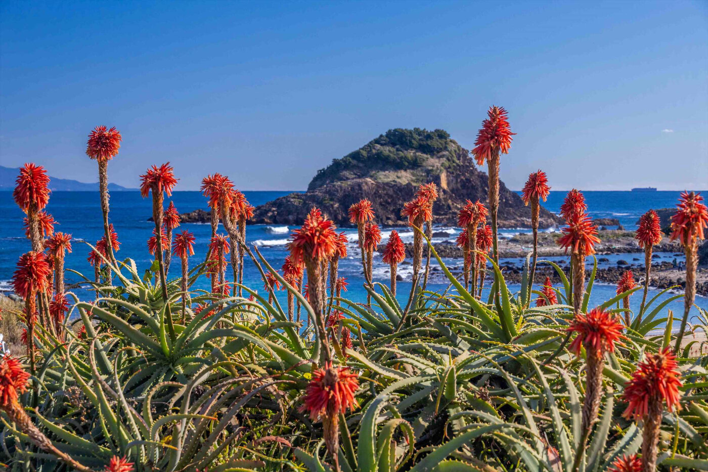 太平洋の青い海をのぞむ丘陵地に野水仙が咲き乱れ、1月の最盛期にはその数約300万本。水仙の甘い香りと冬でも少しあたたかな海風の香りに心が癒される場所。同じ時期に赤いキャンドルのようなキダチアロエの花も咲き、南国の海に来たような景観が広がります。半島の先端に佇む真っ白な爪木崎灯台も見どころ。