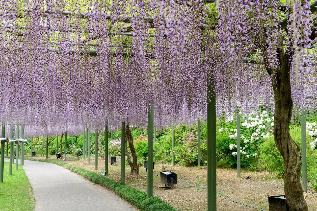 水仙8万球、チューリップ50万球、桜1,300本、藤(野田九尺藤棚80m、白藤棚70m、八重黒竜、他鉢植え)、ツツジ・シャクナゲ類50種13,000本、梅110種300本、花菖蒲4,750?70万本、薔薇200種1,000株、あじさい40種5,000株、ひまわり7,000本等々