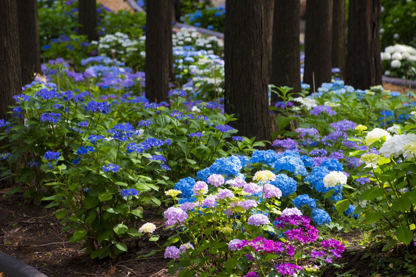 日本最長の歩行者専用吊り橋として有名な「三島スカイウォーク」を渡った先には、7,000m2のあじさい園があり、約200種13,000株のあじさいが咲きます。