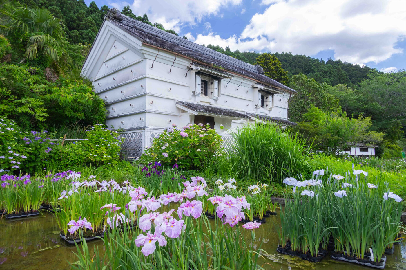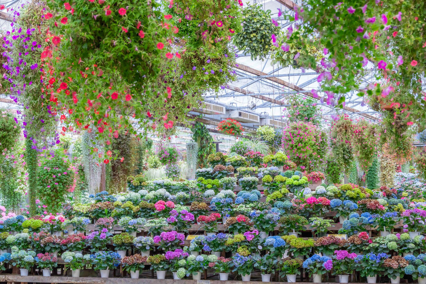 600品種50万本もの花菖蒲を保存・栽培する施設。極早咲き品種もあり、4月末から開花します。アジサイもオリジナル品種が多く、温室のアジサイヒルズの鉢は購入可能。
